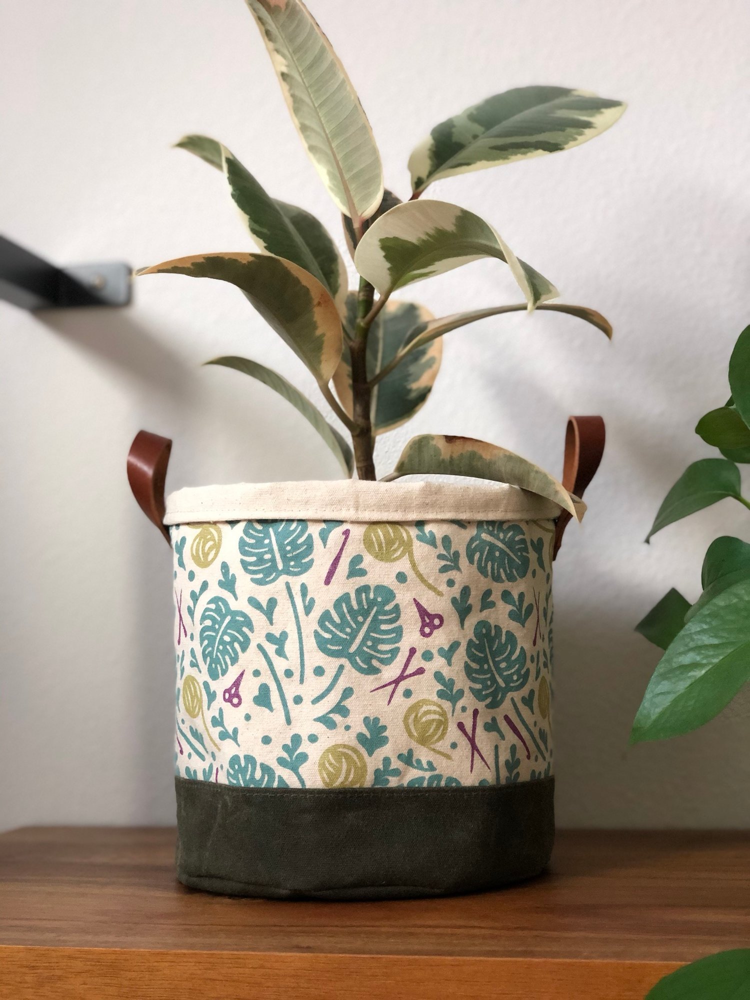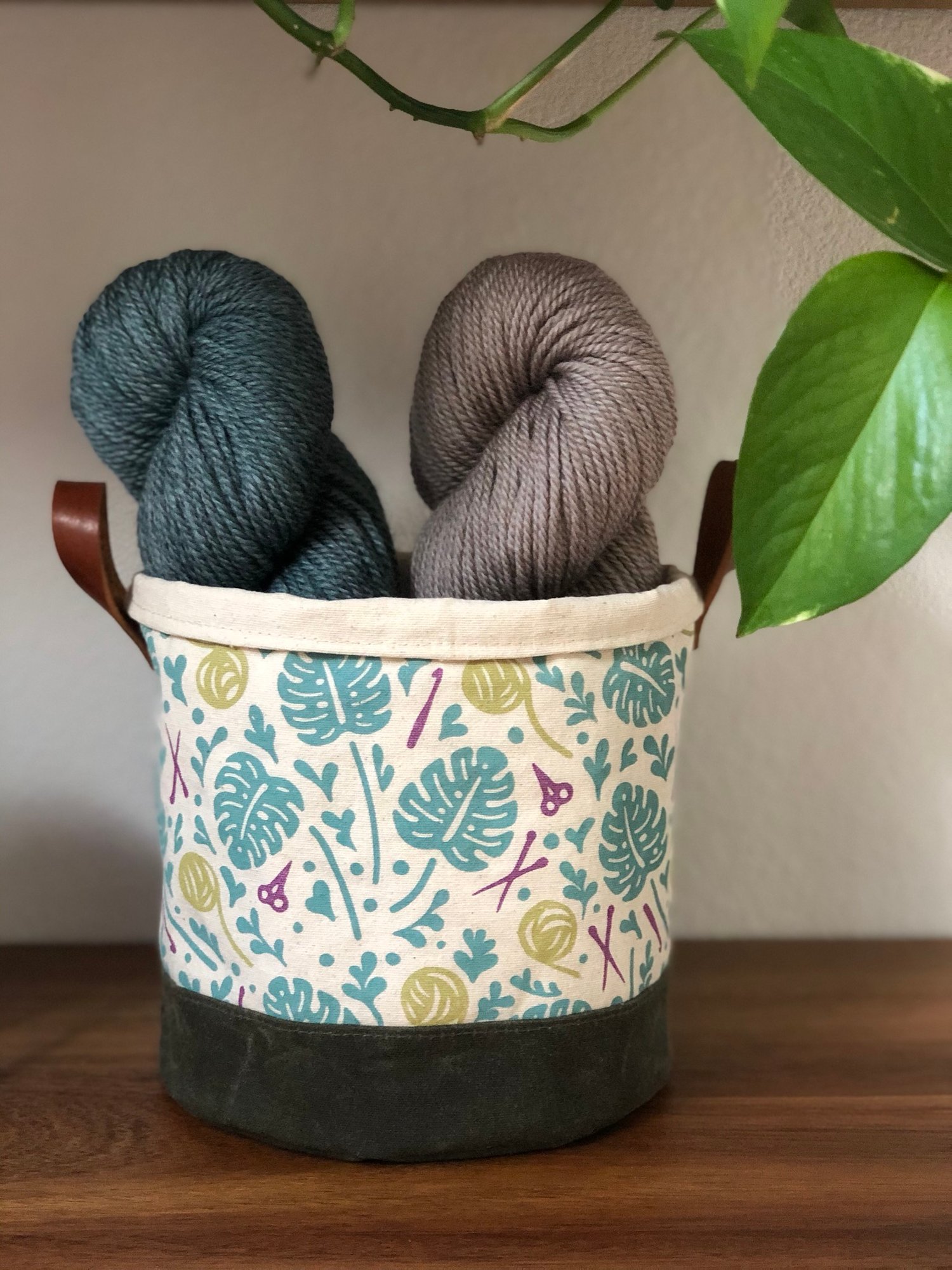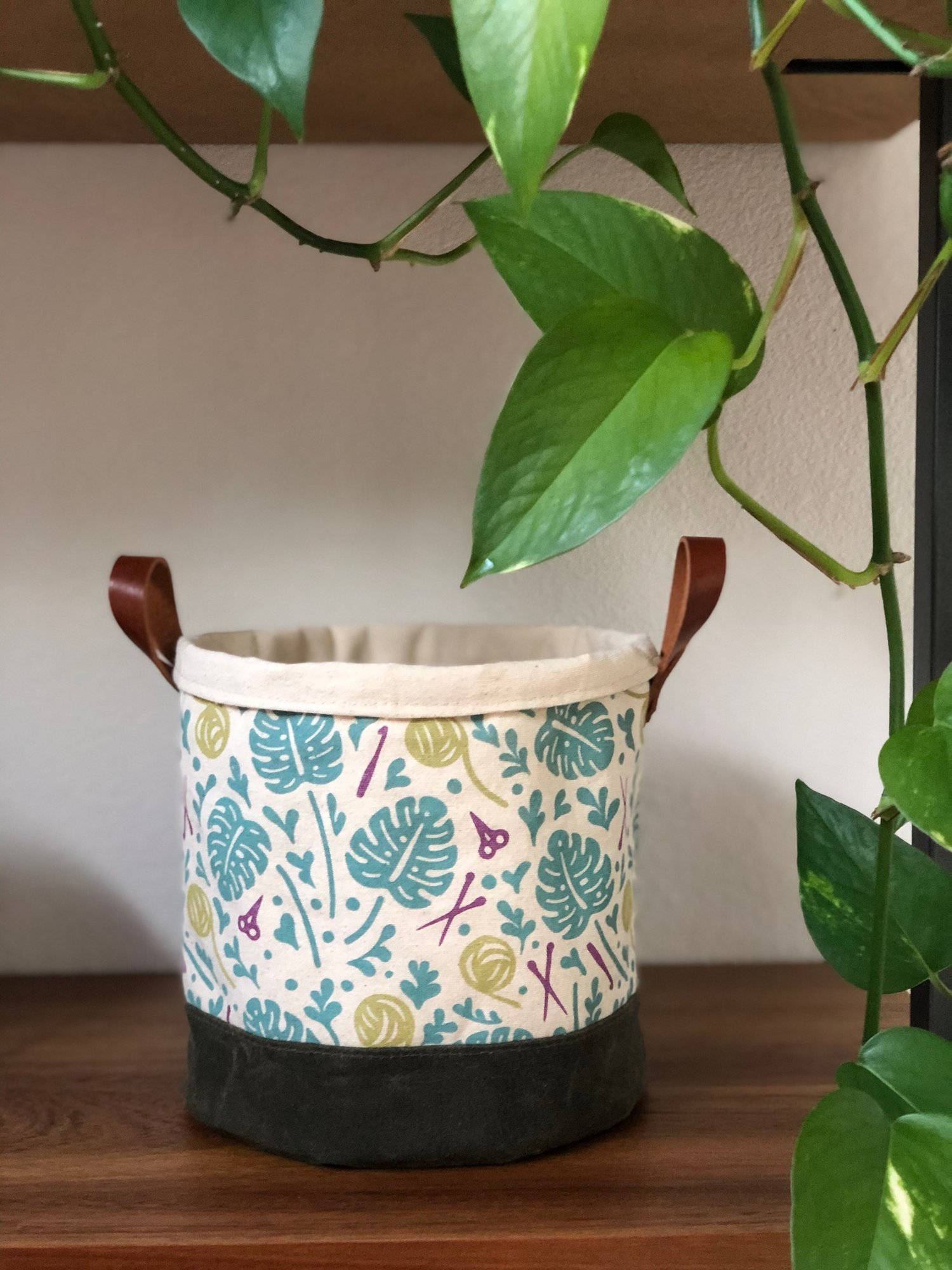 This bag measures 6.5 inches in diameter, 6.5 inches tall. It features a waxed canvas bottom, decorative leather loops, and interior pockets all around, perfect for a small knitting project. It can also be used as a decorative planter.