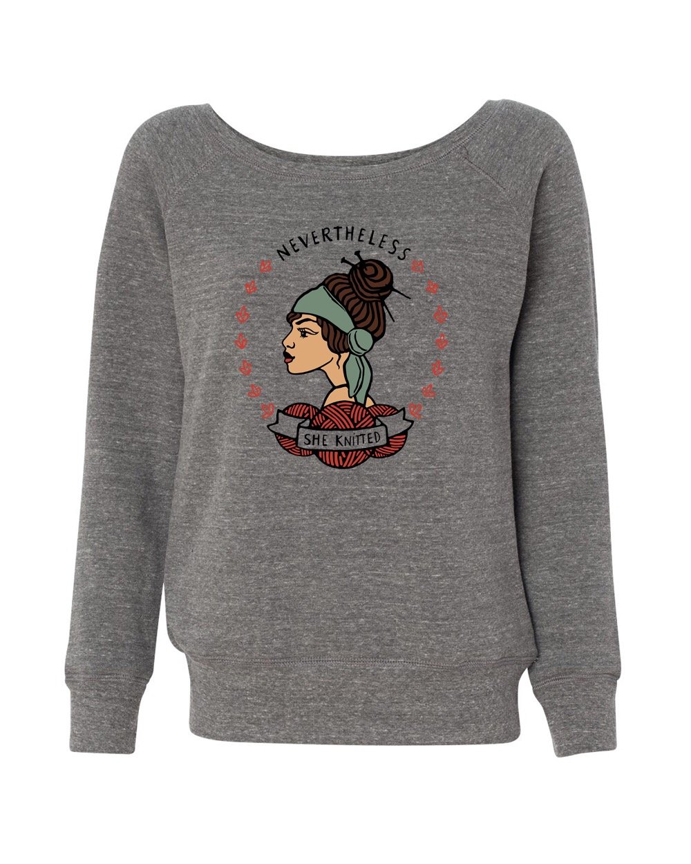 I live in my sweatshirts and searched for the perfect one to offer this design on. The wideneck, women's sweatshirt is incredibly soft to the touch and the perfect shade of gray to compliment all of your knitted accessories!